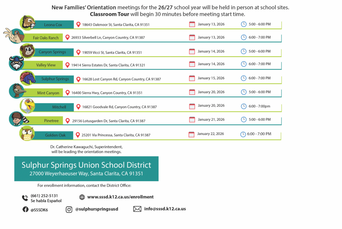 Beginning January 20, 2026, our District will open registration for new families for the 2026–2027 school year. To help families prepare, the Deputy Superintendent, Assistant Superintendents, Principals, and I will be hosting New Families’ Orientation Meetings.