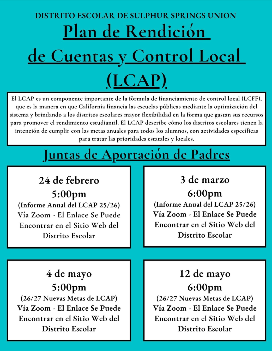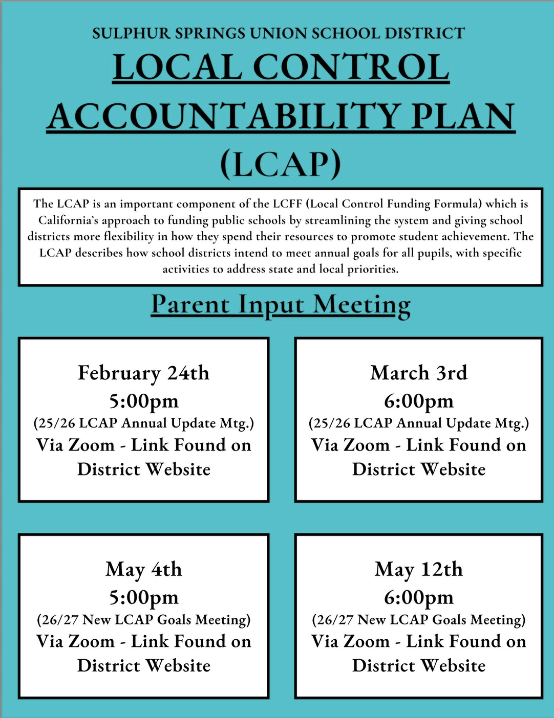 Please go to the District website to access the Zoom links under the tab LCAP.