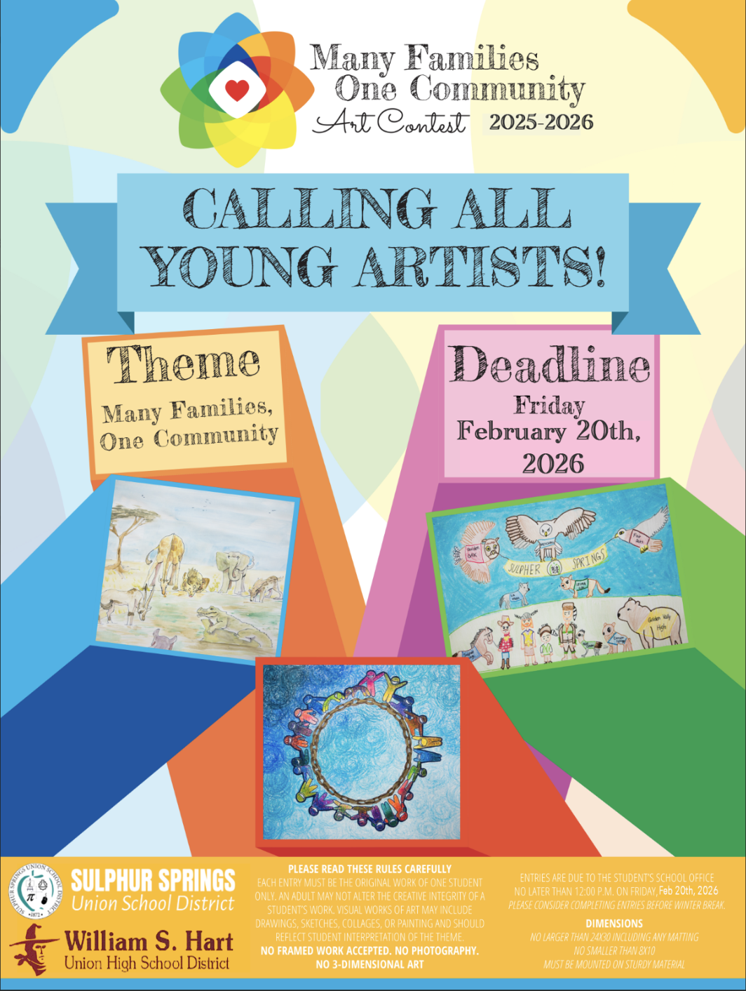 All art entries can be submitted to the school office and will be displayed at the Many Families, One Community Family Resource Fair.